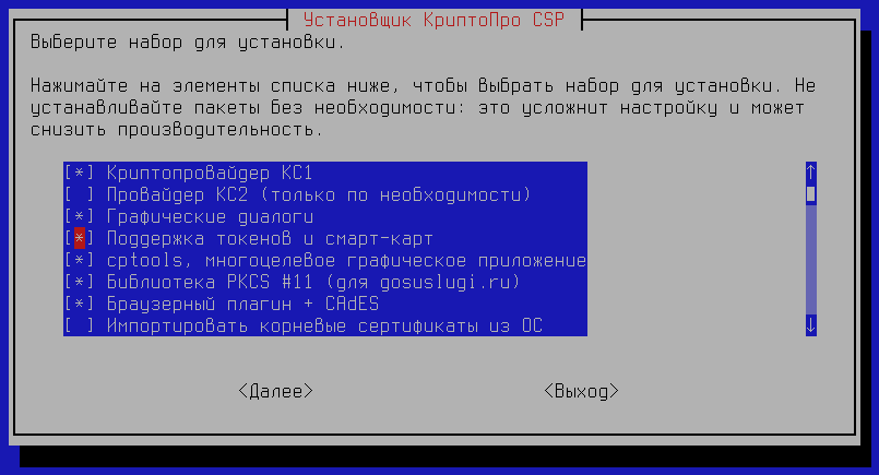 - в процессе установки нужно следовать шагам мастера установки и при выборе набора для установки отметить пункт «Поддержка токенов и смарт-карт». После установки компонентов выйти из мастера установки, нажав экранную кнопку [Выход];