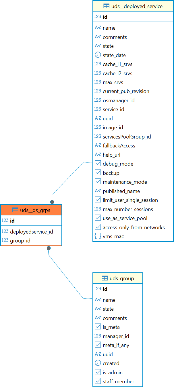 Справочный центр Termidesk Администратору База данных Termidesk Структура базы данных Таблицы Current: Таблица: uds__ds_grps PDF Download PDF Download page Таблица: uds__ds_grps. Current page All pages Таблица: uds__ds_grps Назначение таблицы: хранение данных о связи фонда виртуальных рабочих мест и групп. Перечень полей таблицы uds__ds_grpsПолеОписаниеidИдентификаторdeployedservice_idИдентификатор фонда виртуальных рабочих местgroup_idИдентификатор группыДиаграмма таблицы приведена на рисунке.Диаграмма таблицы uds__ds_grps ×