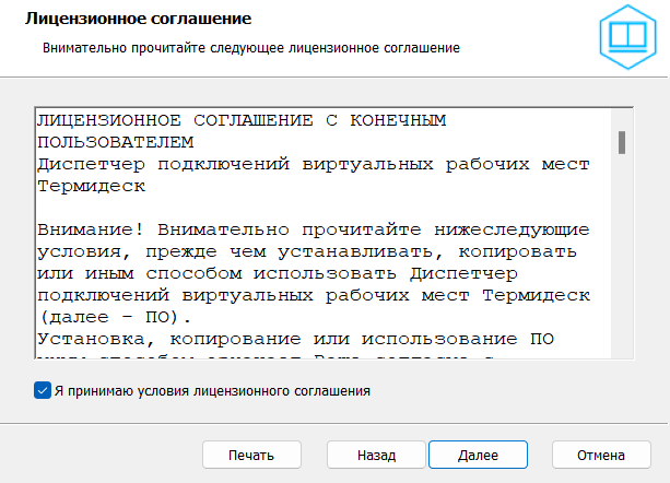 • ознакомиться с лицензионным соглашением. Для принятия условий лицензионного соглашения и продолжения установки следует отметить поле «Я принимаю условия лицензионного соглашения» и нажать экранную кнопку [Далее];