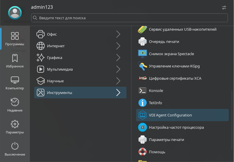 • перейти в графическом интерфейсе ОС в «Звезда - Программы - Инструменты» и выбрать ярлык «VDI Agent Configuration»;
