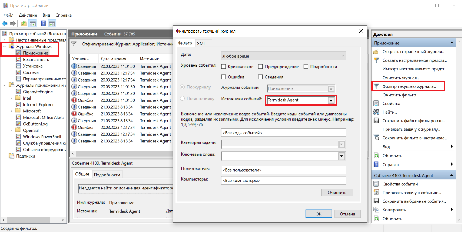 Журнал Агента ВРМ можно также просмотреть в системном журнале ОС Microsoft Windows. Для этого перейти «Пуск - Средства администрирования Windows - Просмотр событий», в открывшемся окне перейти по дереву «Журналы Windows - Приложение», затем в доступных действиях выбрать «Фильтр текущего журнала» и задать в поле «Источники событий» значение «Termidesk Agent», после нажать экранную кнопку [ОК].