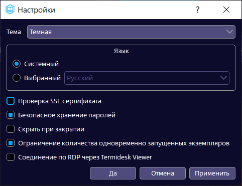 «Безопасное хранение паролей» - активация функции сохранения пароля при подключении к серверу, используя встроенные механизмы ОС. При активации параметра заданный пароль подключения к серверу будет храниться в преобразованном виде;