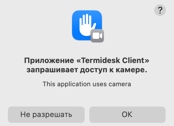 при первом запуске ПО Termidesk Viewer и выборе пункта «Вебкамера» отобразится предупреждение, пример: «Приложение «Termidesk Client» запрашивает доступ к камере». В этом случае нужно: