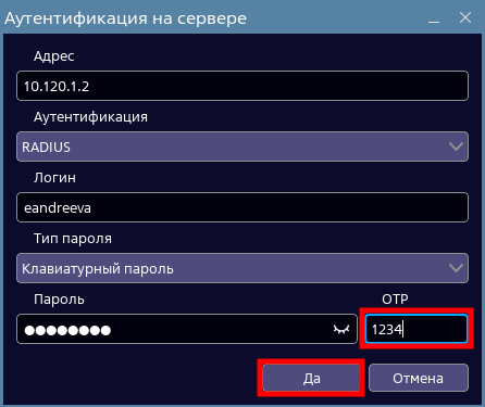 в окне аутентификации на сервере заполнить параметр «OTP» (параметры «Аутентификация» и «Пароль» должны быть также заполнены) и нажать экранную кнопку [Да].
