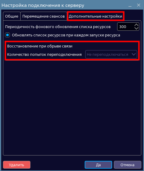 Для настройки параметров обновления списка ресурсов нужно нажать на графический элемент в виде шестеренки в правом верхнем углу для выбранного сервера. В открывшемся окне «Настройка подключения к серверу» на вкладке «Дополнительные настройки» будут доступны следующие параметры управления для восстановления связи: