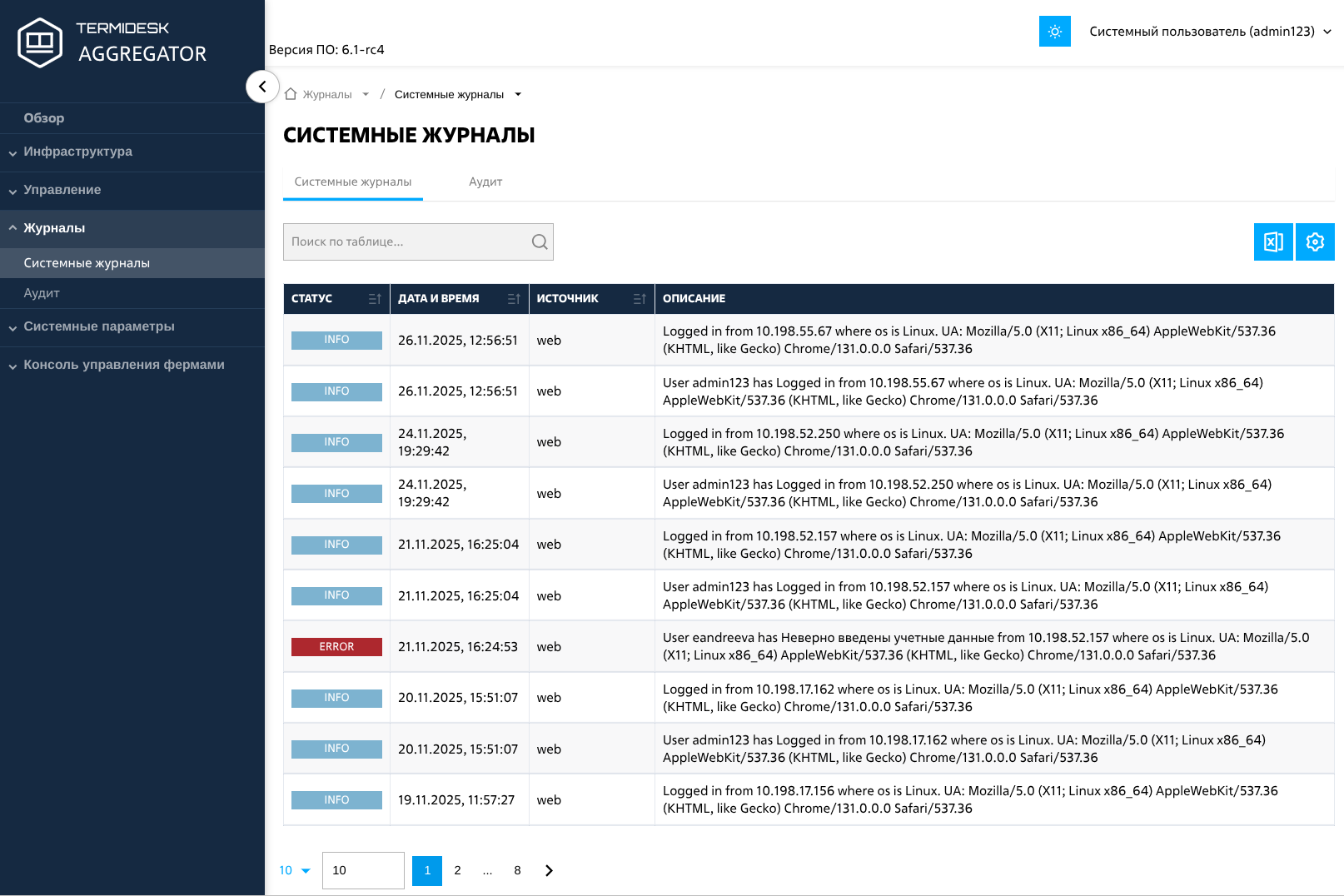 Для просмотра общего журнала событий, связанного с функционированием «Агрегатора» и действиями субъектов доступа, следует перейти «Журналы - Системные журналы», где визуализируются системные события с указанием уровня важности и источника возникновения события. На странице поддерживается поиск записей по таблице.