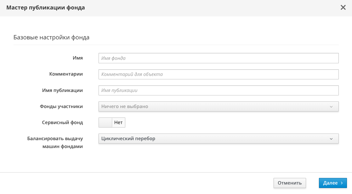 Откроется мастер публикации фонда. Необходимо заполнить параметры, указанные в таблице, и нажать экранную кнопку [Далее]. При нажатии экранной кнопки [Отменить] или клавиши <Esc>, или иконки «Крестик» на любом из этапов работы произойдет закрытие мастера без сохранения настроек.