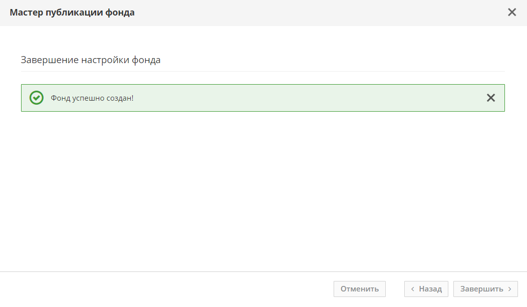 В следующем окне завершить настройку фонда, нажав экранную кнопку [Завершить]. Далее будет отображено временное окно с заблокированными экранными кнопками. При успешном создании фонда в этом же окне должно появиться сообщение «Фонд успешно создан!», окно будет автоматически закрыто по истечении 3 секунд.