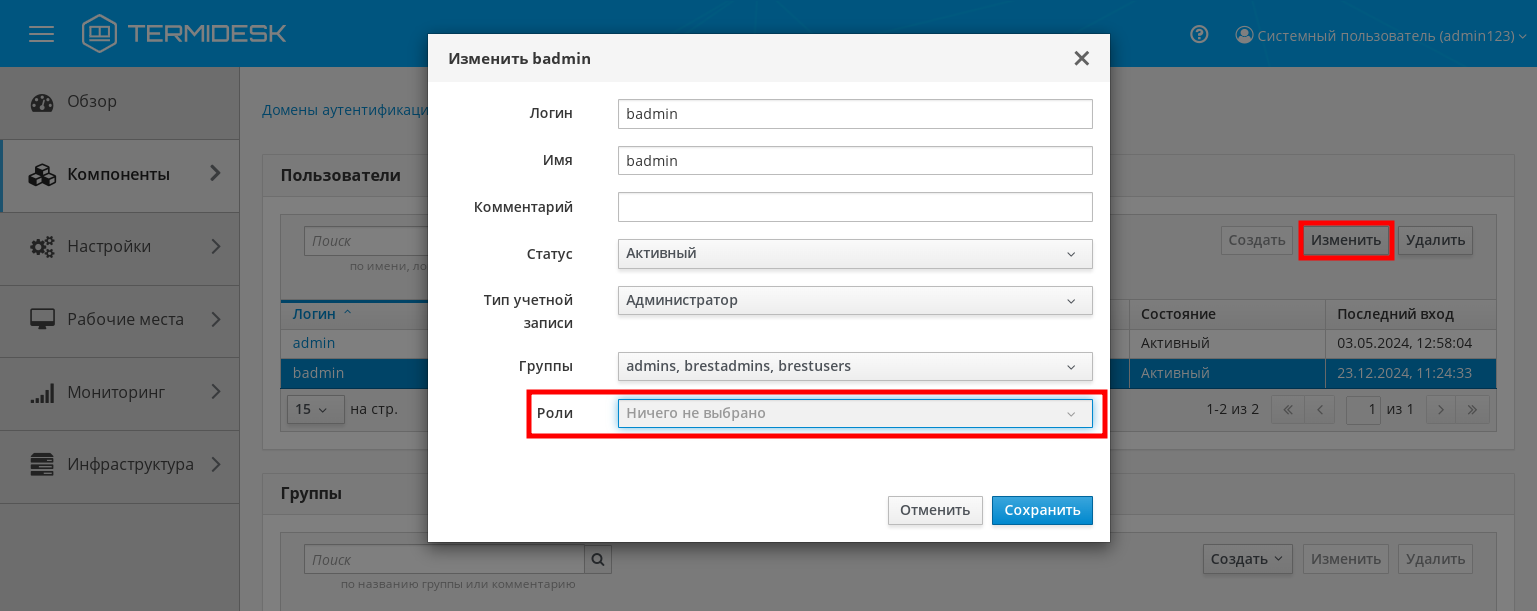 | «Просмотр объектов инфраструктуры» | Предоставляет доступ на чтение страниц раздела «Инфраструктура» для просмотра информации о статусе компонентов Termidesk |