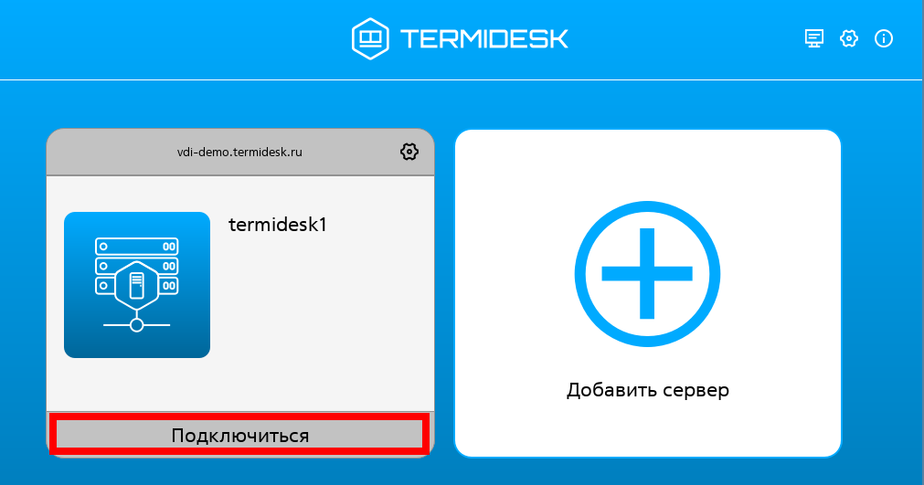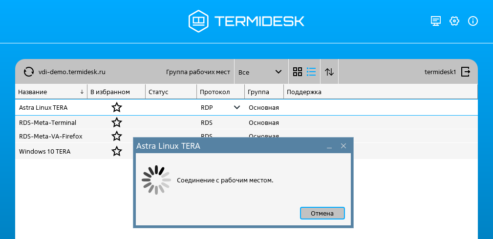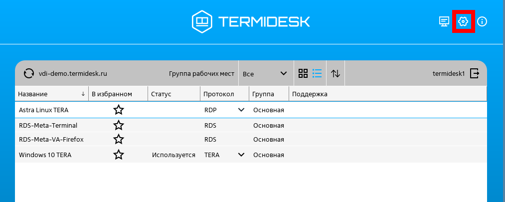 Для ознакомления с функционалом Termidesk можно подключиться к демо-стенду, в котором реализовано преднастроенное рабочее место. Для подключения необходимо установить компонент «Клиент» (Клиент) из состава Termidesk.