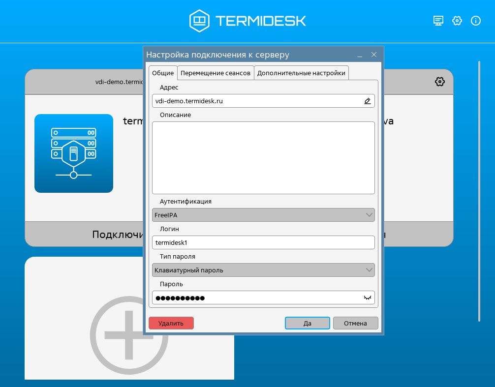 vdi-demo.termidesk.ru; - заполнить поля: