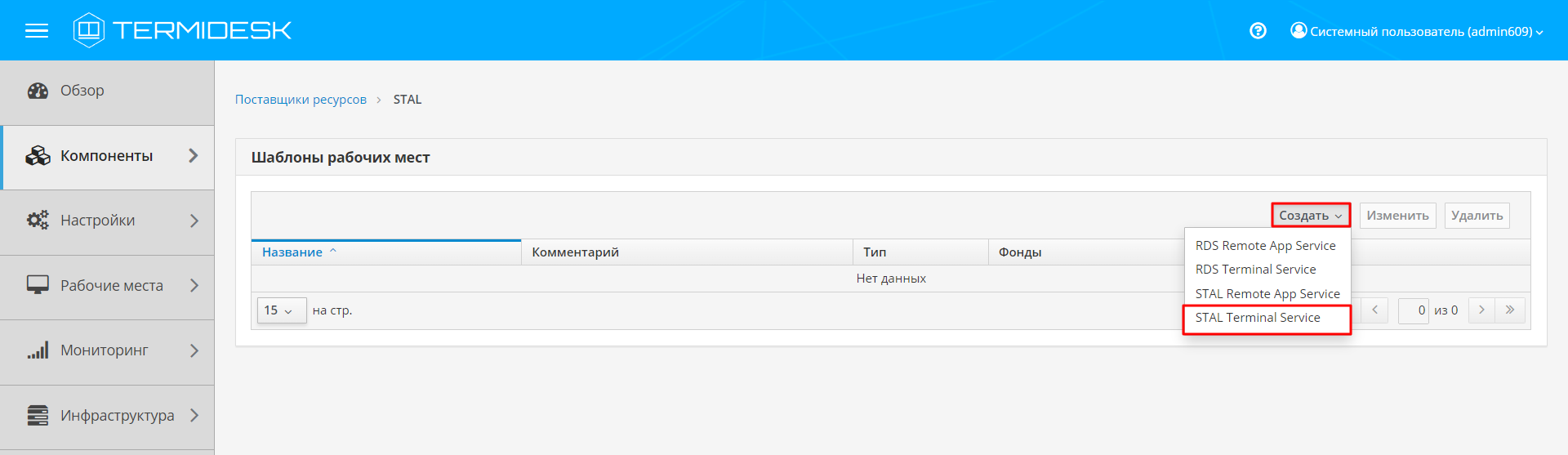 Для добавления поставщика ресурсов STAL в графическом интерфейсе управления Termidesk следует перейти «Компоненты — Поставщики ресурсов», затем нажать на экранную кнопку [Создать] и выбрать из выпадающего списка «Сервер Терминалов [экспериментальный]».