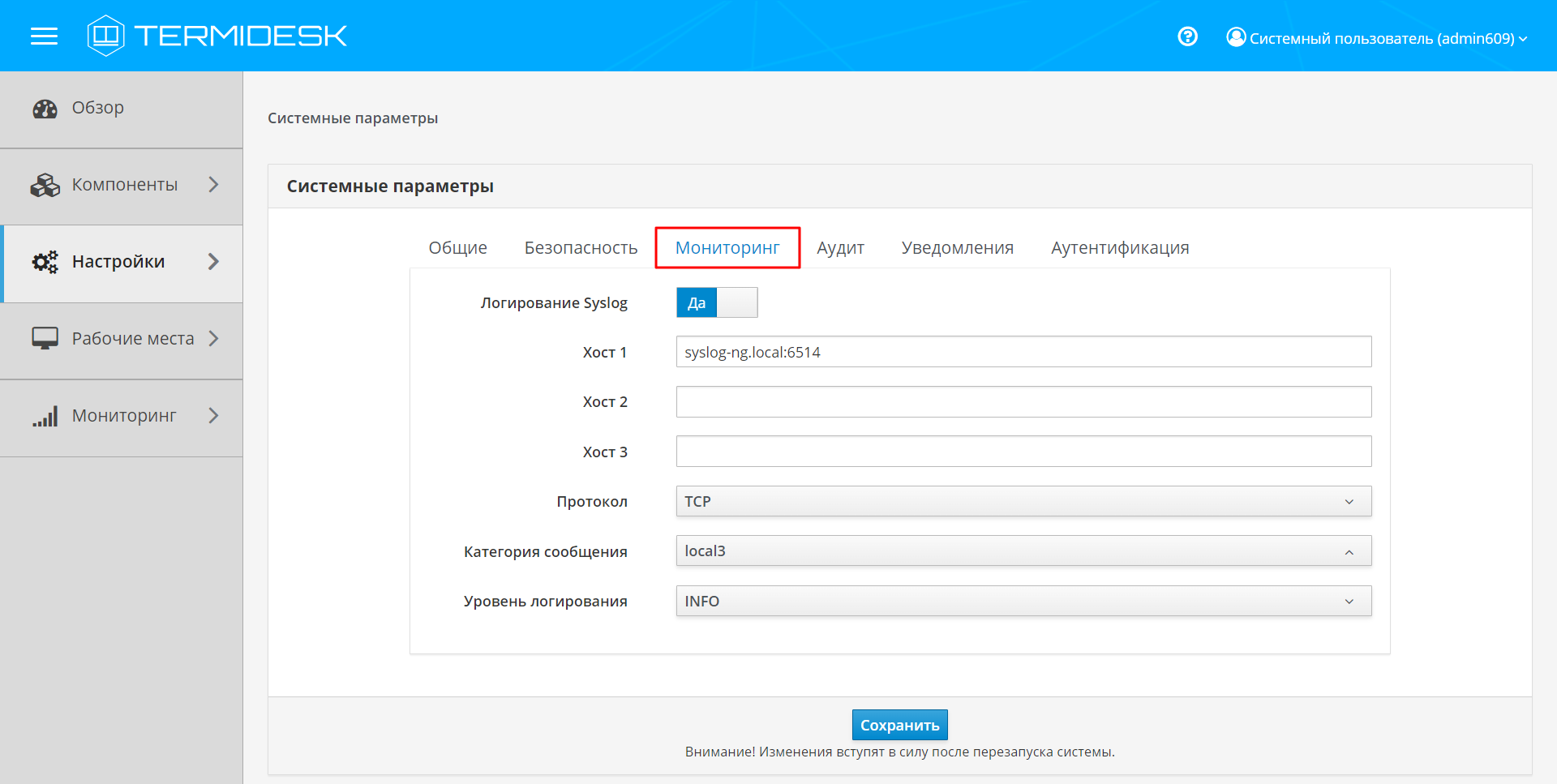 Для работы сервера Termidesk с сервером журналирования syslog-ng в графическом интерфейсе управления Termidesk нужно перейти «Настройки — Системные параметры — Мониторинг» и задать соответствующие параметры.