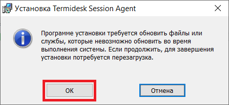 - при появлении сообщения о необходимости перезагрузки нужно согласиться с перезагрузкой системы, нажав кнопку [ОК]. В противном случае установка будет прервана.