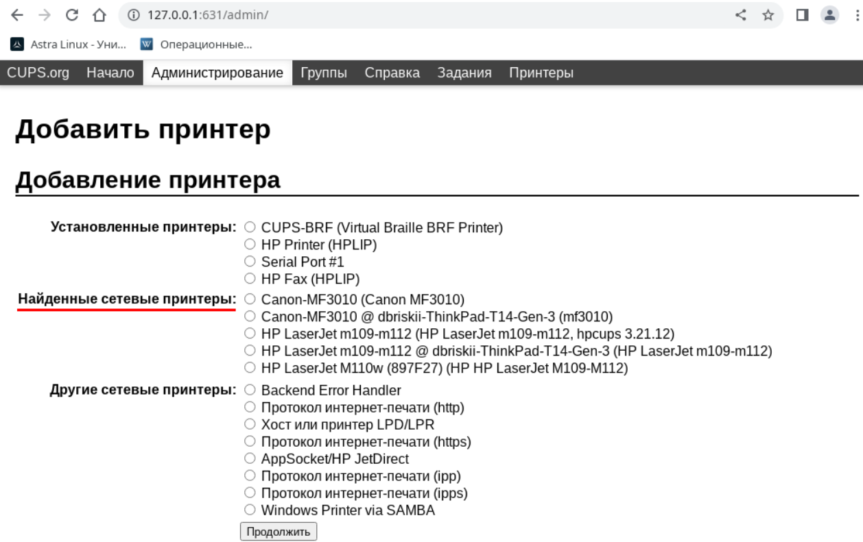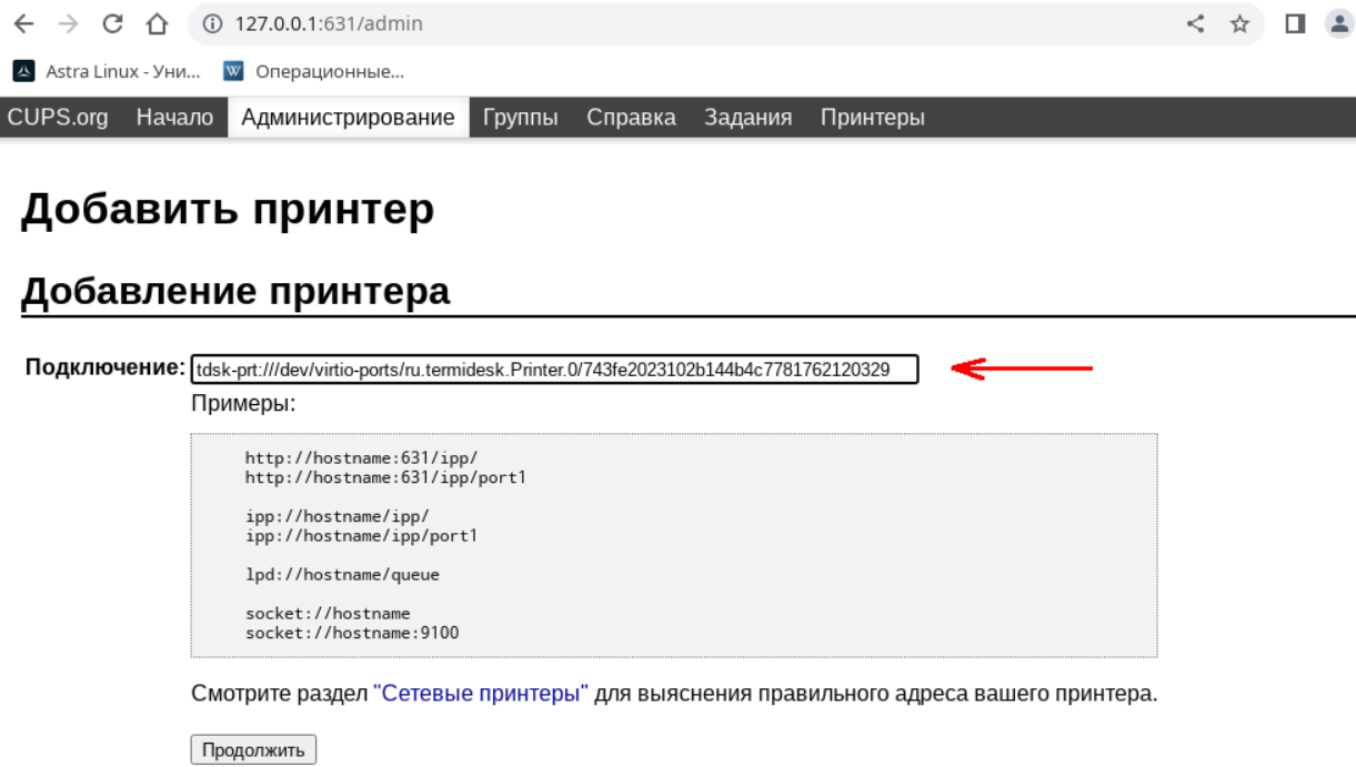 - открыть в браузере URL-адрес: http://127.0.0.1:631/;