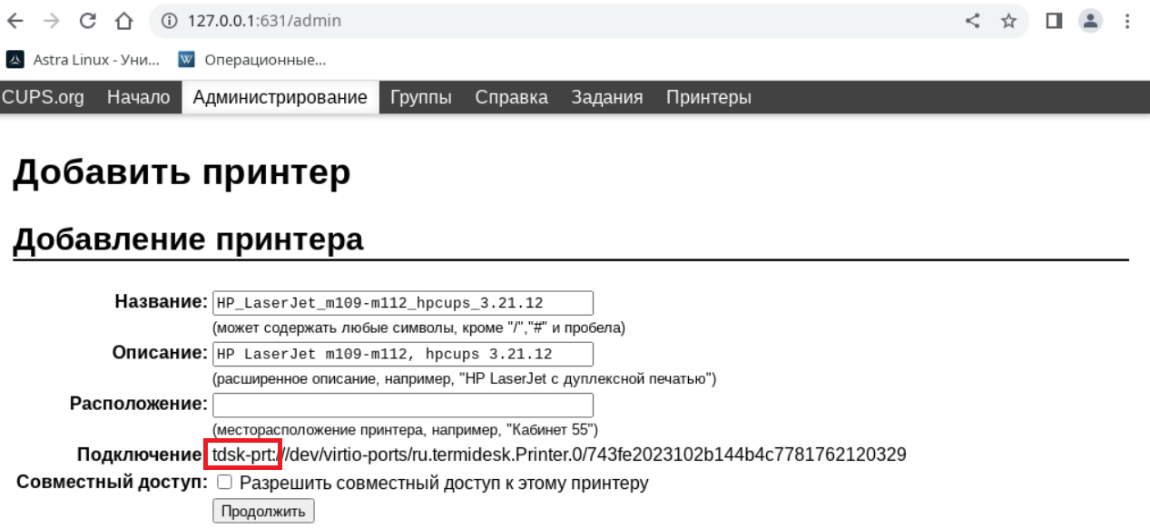 Для ручного добавления принтера через веб-интерфейс службы CUPS нужно: