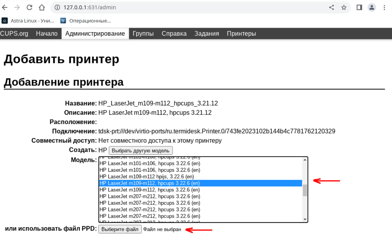 - выбрать модель принтера из списка или использовать файл драйвера принтера PPD;