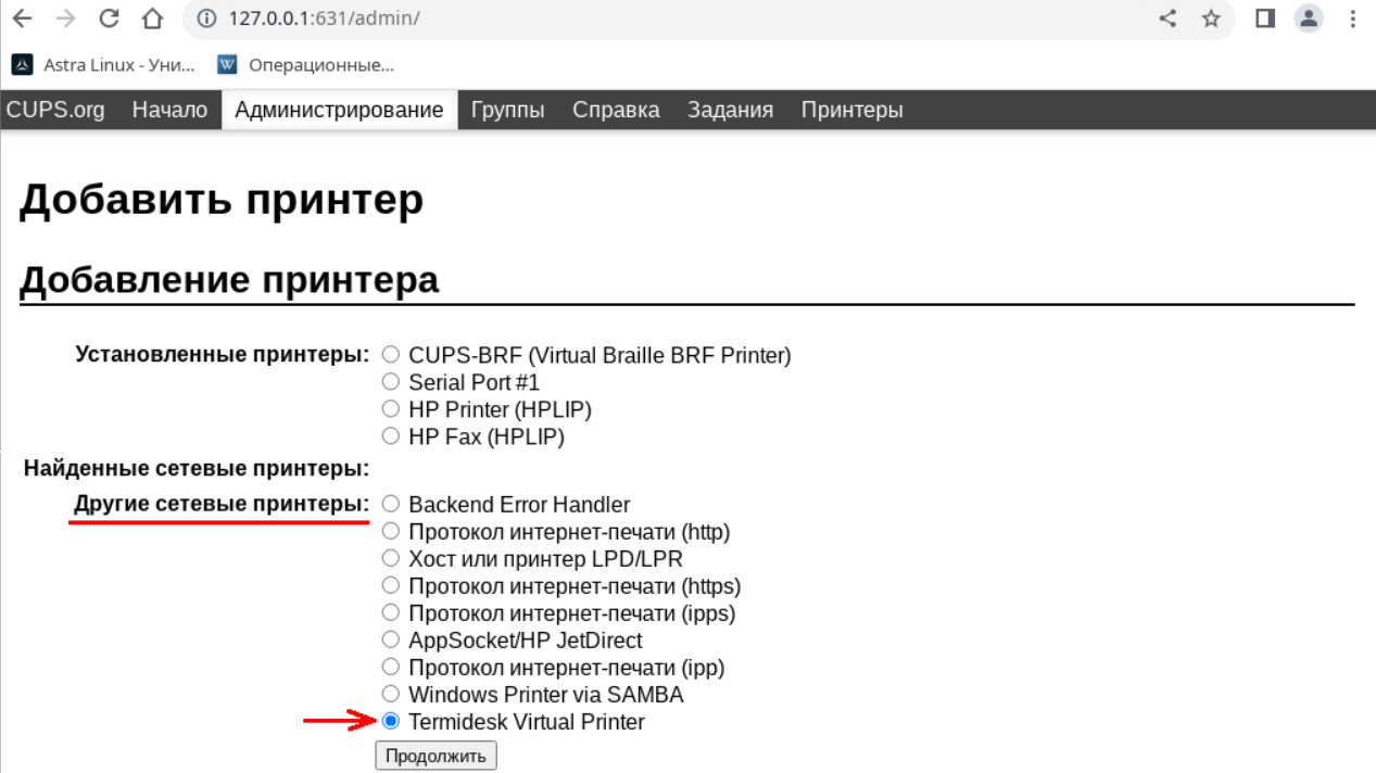 - выбрать значение «Termidesk Virtual Printer» в списке «Другие сетевые принтеры»;