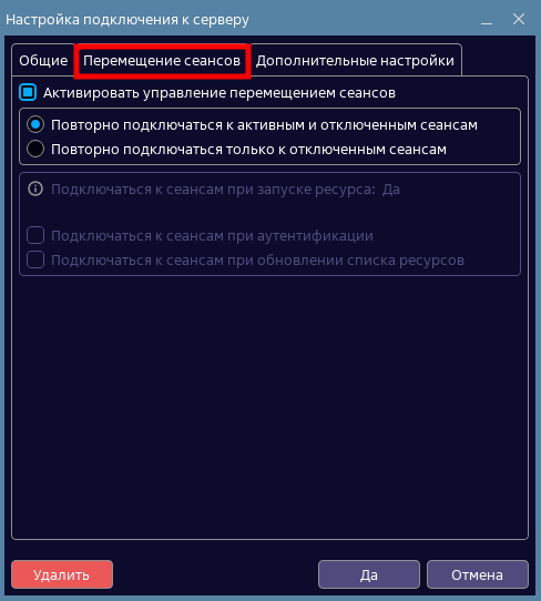 - «Активировать управление перемещением сеансов» - параметр активации элементов управления повторным подключением: