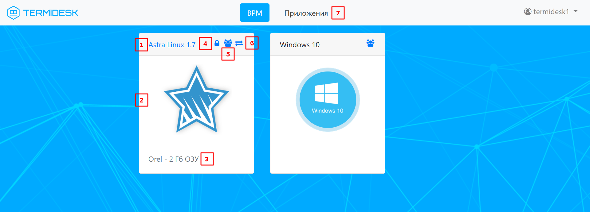 - элемент (6) - графический примитив, визуализирующий возможность выбора пользователем протокола доставки. При нажатии на иконку Termidesk инициирует открытие вспомогательного окна, в котором перечислены доступные протоколы доставки. Доставка РМ по выбранному протоколу начинается после нажатия в окне «Подключения» ссылки с названием протокола;