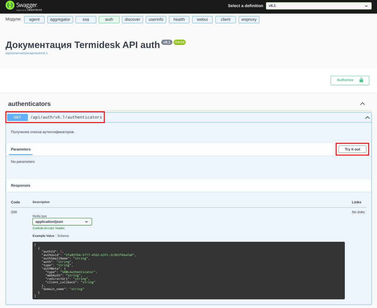 - выполнить запрос «https://disp.termidesk.local/api/auth/v6.1/authenticators»;