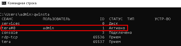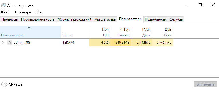 - из «Диспетчера задач» ОС. Для этого открыть «Диспетчер задач» и перейти во вкладку «Пользователи». TERA-подключение будет содержать в имени сеанса «TERA» и идентификатор (номер открытого консольного сеанса);