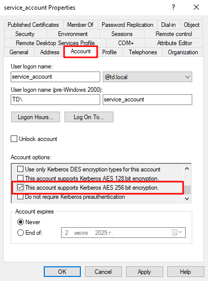 - в свойствах учетной записи во вкладке «Account» активировать параметр «This account supports Kerberos AES 256 bit encryption»;