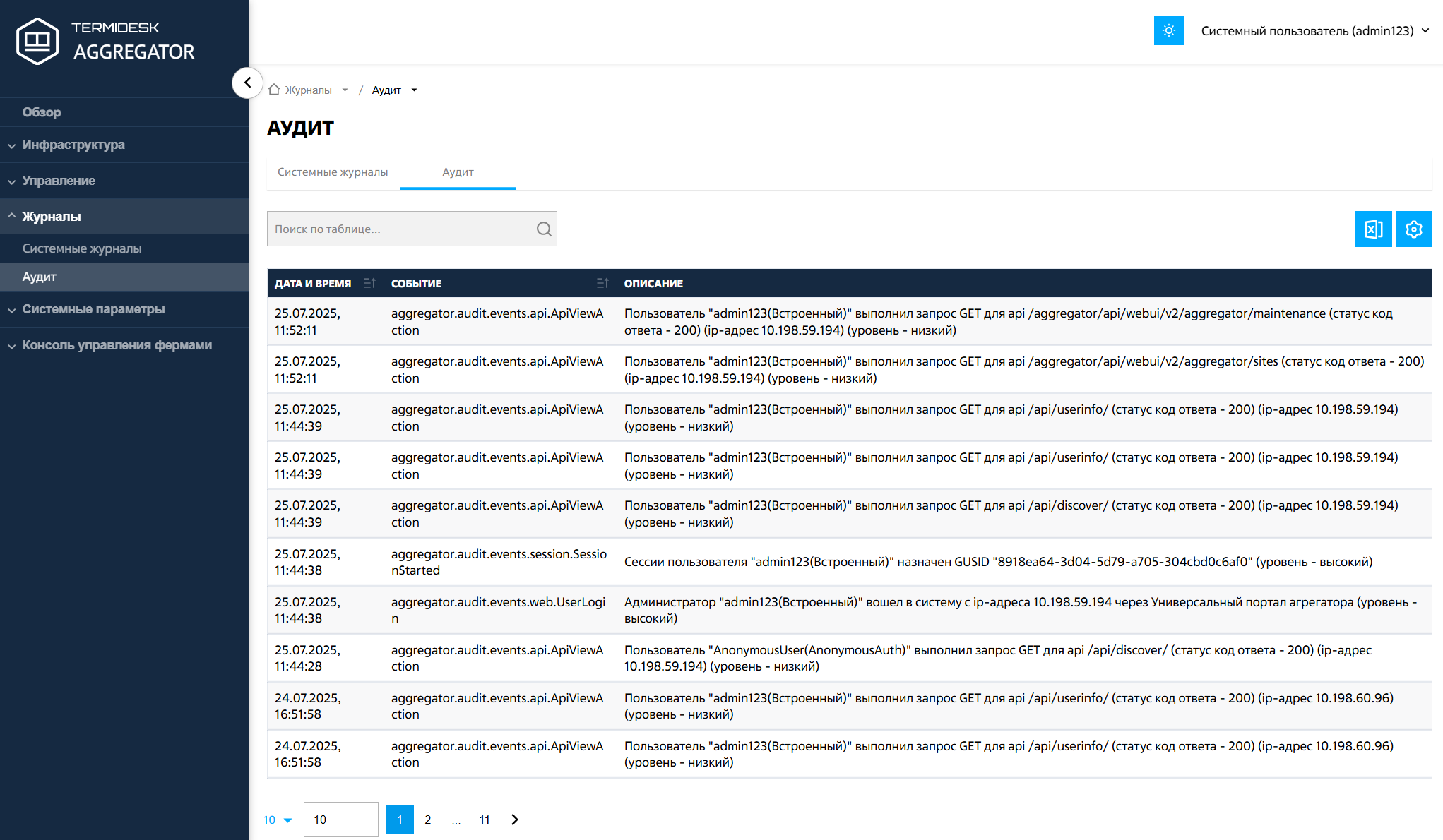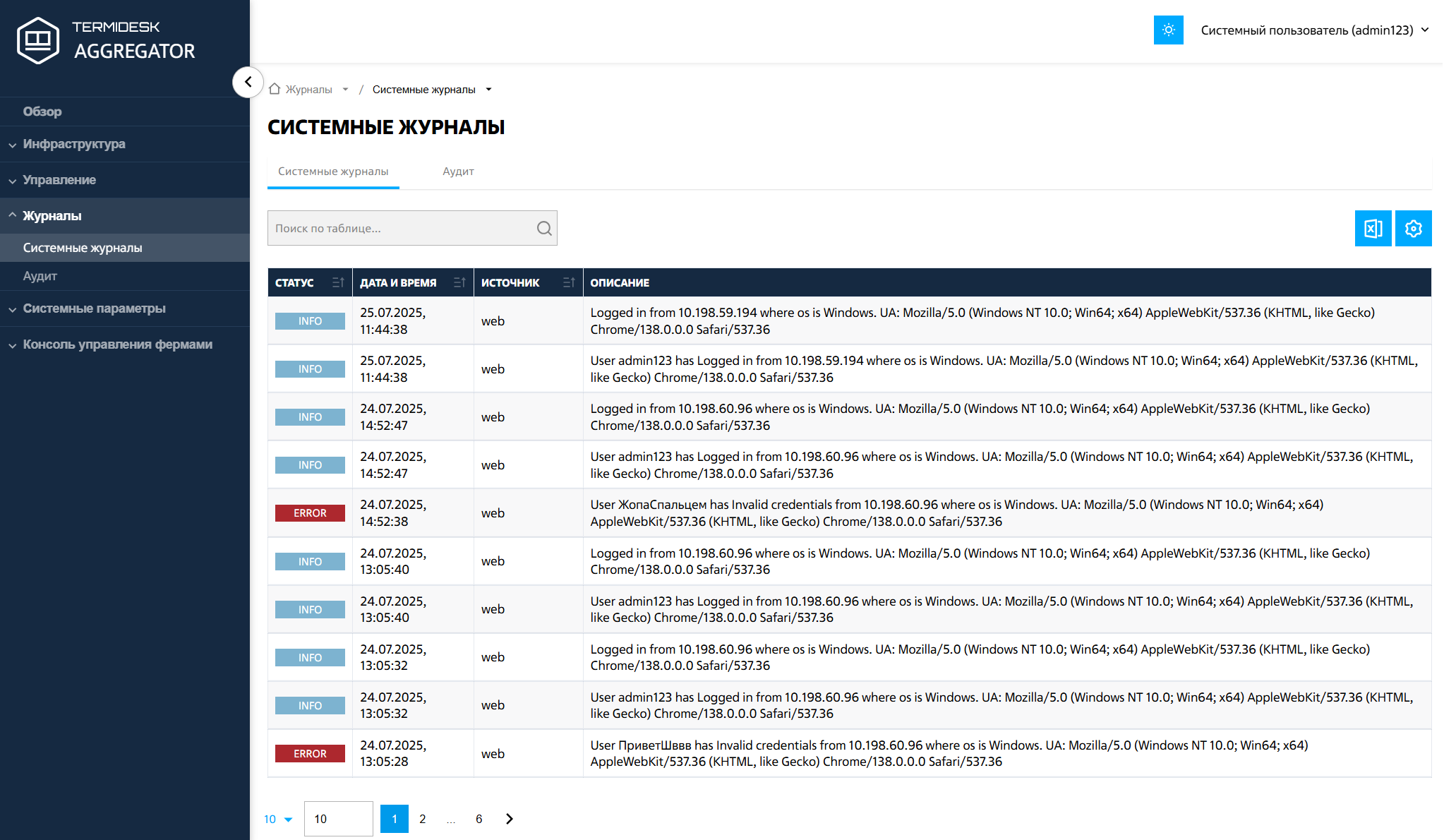 Для просмотра общего журнала событий, связанного с функционированием «Агрегатора» и действиями субъектов доступа, следует перейти «Журналы - Системные журналы», где визуализируются системные события с указанием уровня важности и источника возникновения события. На странице поддерживается поиск записей по таблице.