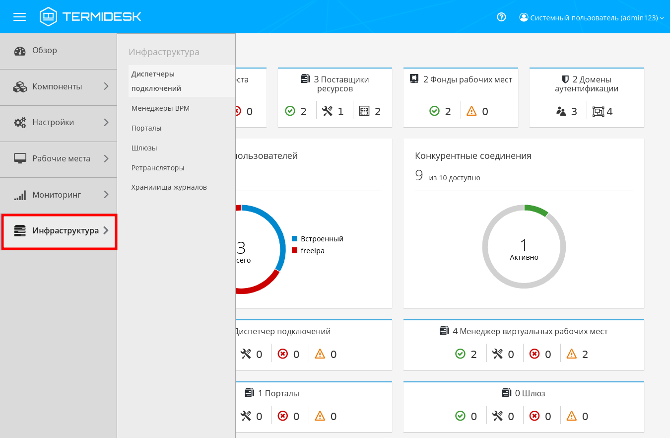 При нажатии в левой части веб-интерфейса на функцию «Инфраструктура» открывается процедура «Элементы инфраструктуры», позволяющая централизованно управлять компонентами Termidesk и просматривать их статус.