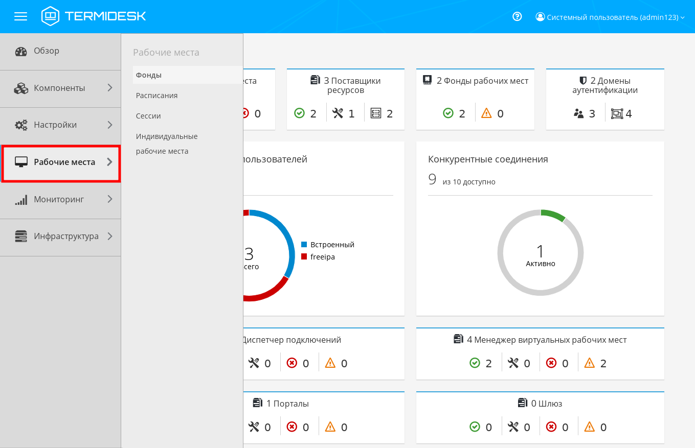 В графическом интерфейсе Termidesk термины «рабочее место» и «фонды рабочих мест» относятся к РМ и фондам РМ, соответственно.