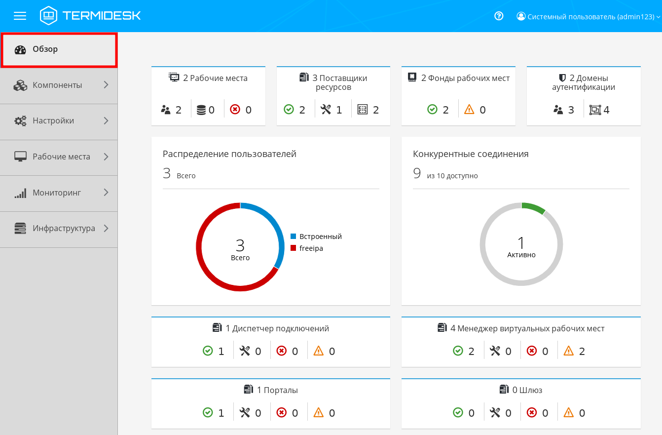 - «Распределение пользователей» – диаграмма общего числа пользователей Termidesk с количественным распределением по доменам аутентификации;