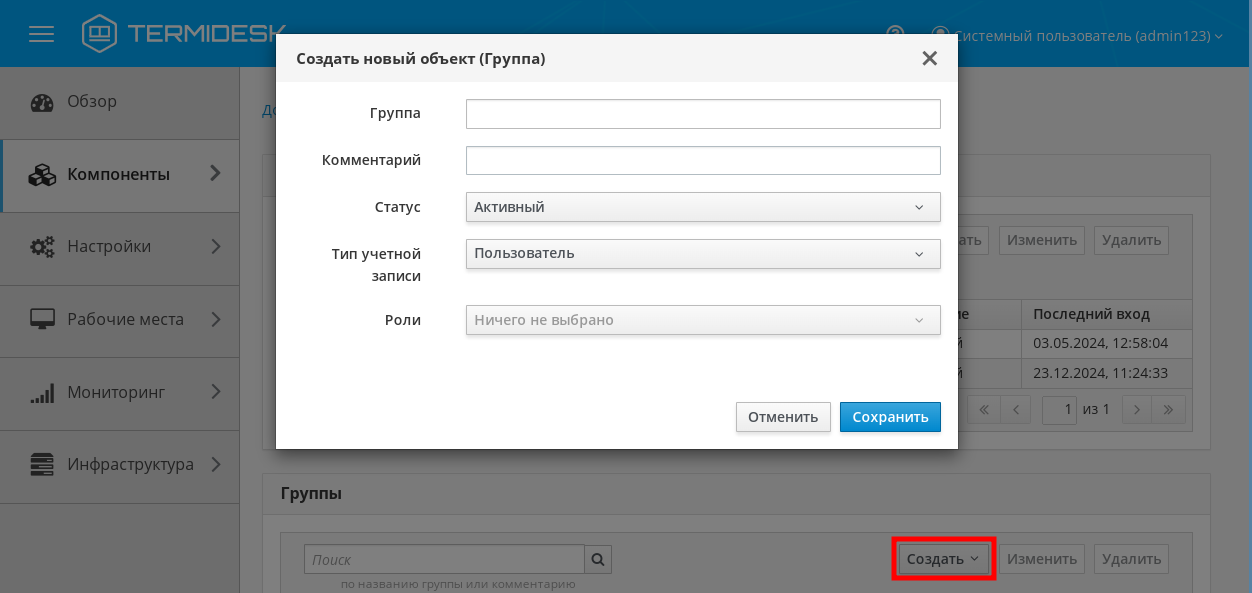 - создание - добавление существующей в службе каталогов группы в Termidesk;