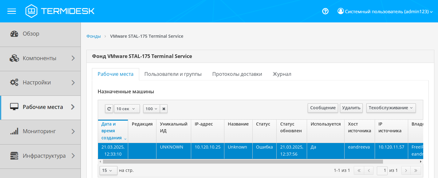 | «Удалить» | Отключение выбранной сессии для терминальных подключений. Отображение статуса «Удален» в столбце «Статус» свидетельствует об успешном удалении сессии. Терминальные сессии также могут быть удалены на странице «Рабочие места - Индивидуальные рабочие места» |