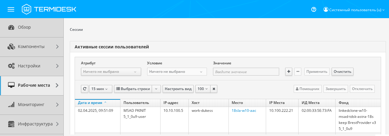 Функционал управления сессиями (завершение, отключение) пользователя из страницы «Рабочие места - Сессии» доступен для терминальных сессий.