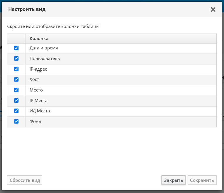 - список отображаемых столбцов. Для изменения списка нужно воспользоваться экранной кнопкой [Настроить вид] и отметить наименования столбцов, которые будут отображены, или снять отметку с наименований, которые должны быть скрыты из отображения. Для применения изменений нужно нажать экранную кнопку [Сохранить]. При попытке убрать выбор со всех пунктов экранная кнопка [Сохранить] будет заблокирована. Для возврата к исходному состоянию отображения следует воспользоваться экранной кнопкой [Сбросить вид];