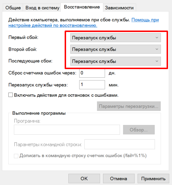 spice-agent(Spice Agent),vdservice(SPICE VDAgent) иTermideskService(Termidesk AgentDaemon) назначить значение «Перезапуск служб» для действий при сбое. Для этого перейти «Диспетчер задач» - «Службы» - «Открыть службы», правой кнопкой мыши нажать на нужное наименование и перейти «Свойства» - «Восстановление».
