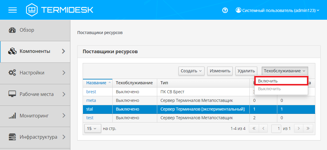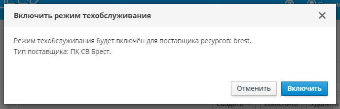 Для перевода поставщика ресурсов в режим техобслуживания следует перейти «Компоненты - Поставщики ресурсов» и нажать экранную кнопку [Техобслуживание] с выбором из выпадающего списка значения «Включить». Затем подтвердить включение режима.
