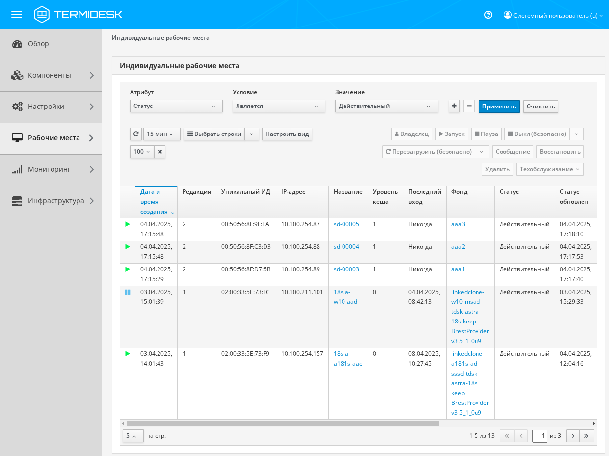 Для более эффективного администрирования Termidesk предусмотрено отображение РМ из всех фондов, в том числе назначенных РМ, а также созданных и размещенных в кеше.