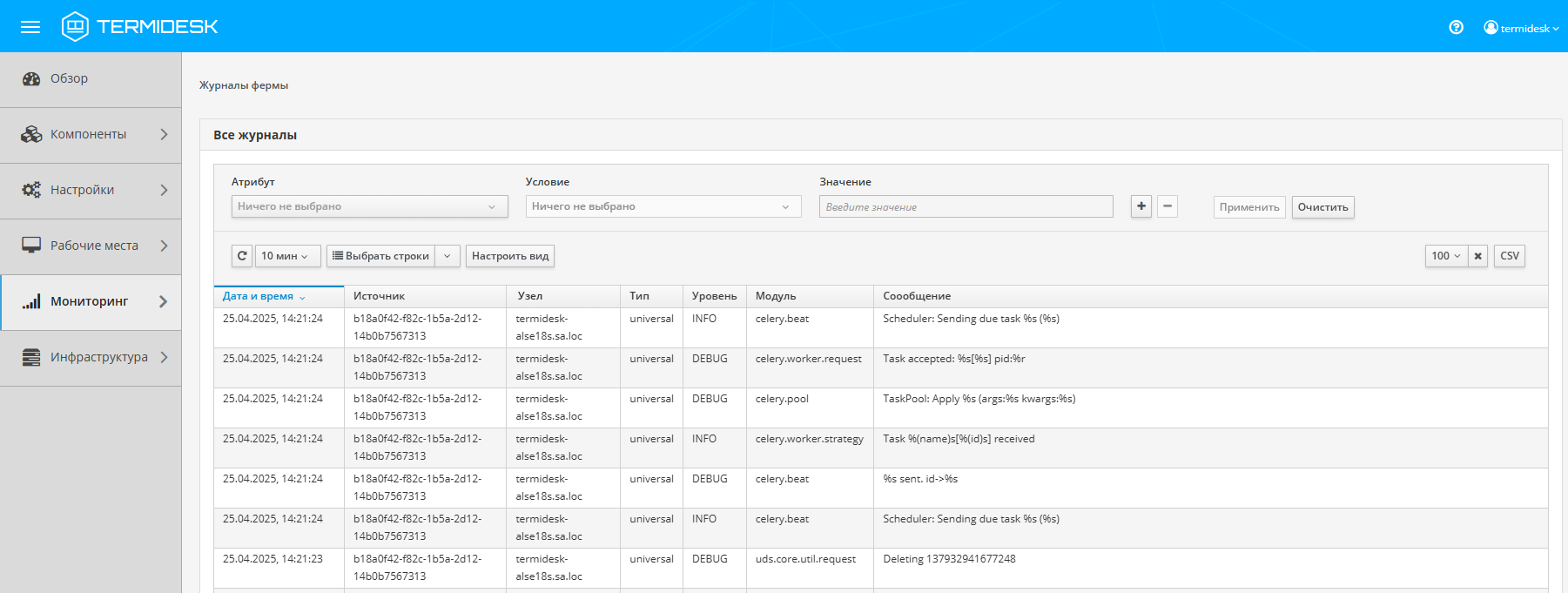 Для просмотра централизованных журналов событий, связанных с функционированием фермы Termidesk, следует перейти «Мониторинг - Журналы фермы», где визуализируются события из «Хранилища журналов».