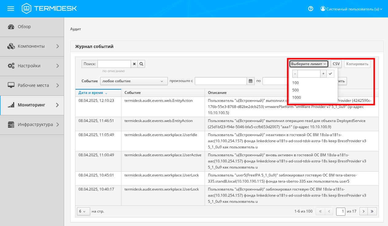 Количество событий, отображаемых в графическом интерфейсе или экспортируемых в csv-файл, также можно менять при помощи экранной кнопки [Выберите лимит], как это приведено в подразделе Просмотр системного журнала.