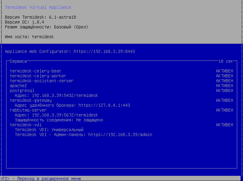 После выполнения шагов по комплексной установке фермы произойдет переход в окно управления ВМТ. Службы Termidesk будут автоматически активированы, перезагрузка не требуется. IP-адрес, отображаемый в главном окне ВМТ, соответствует IP-адресу первого настроенного интерфейса.